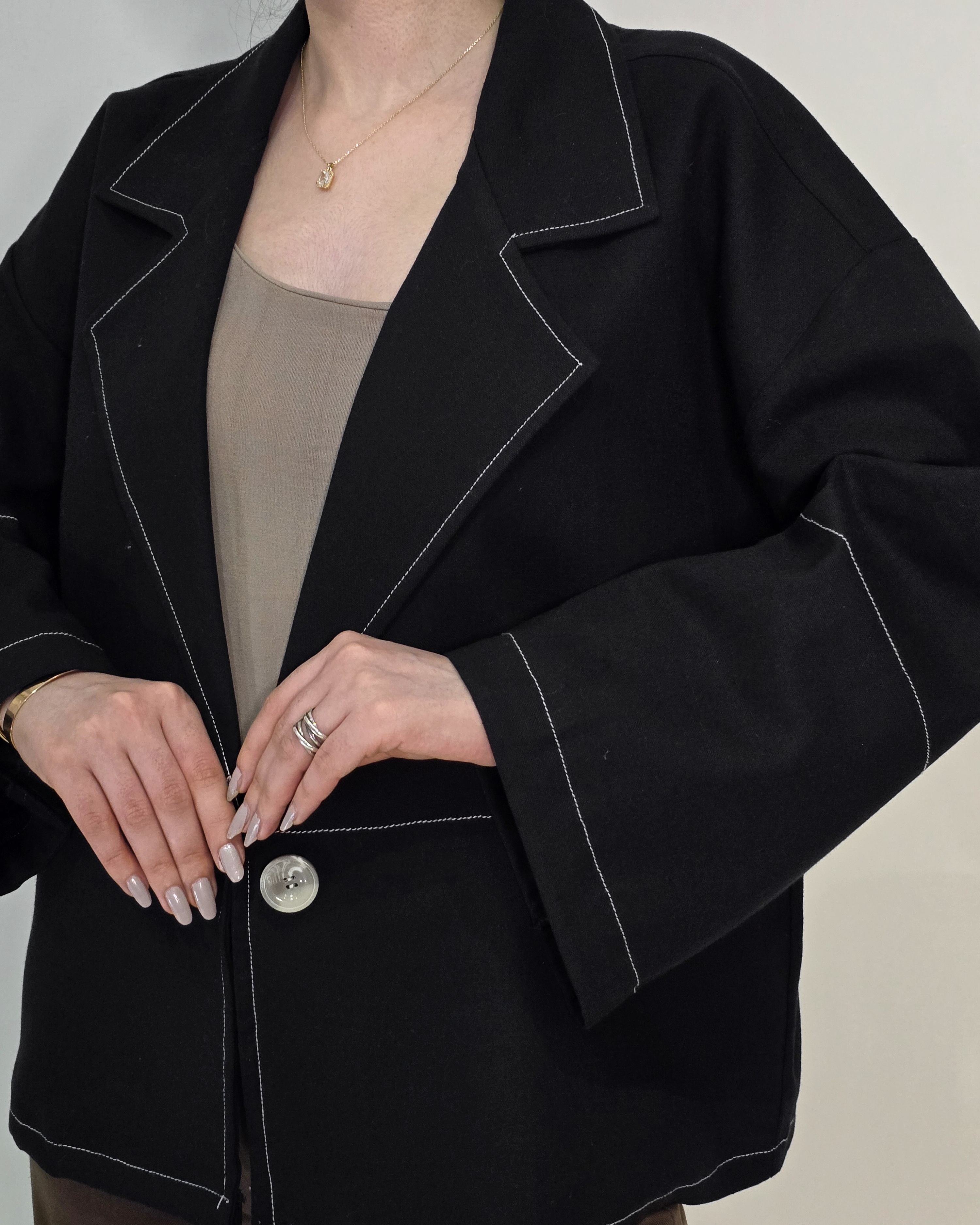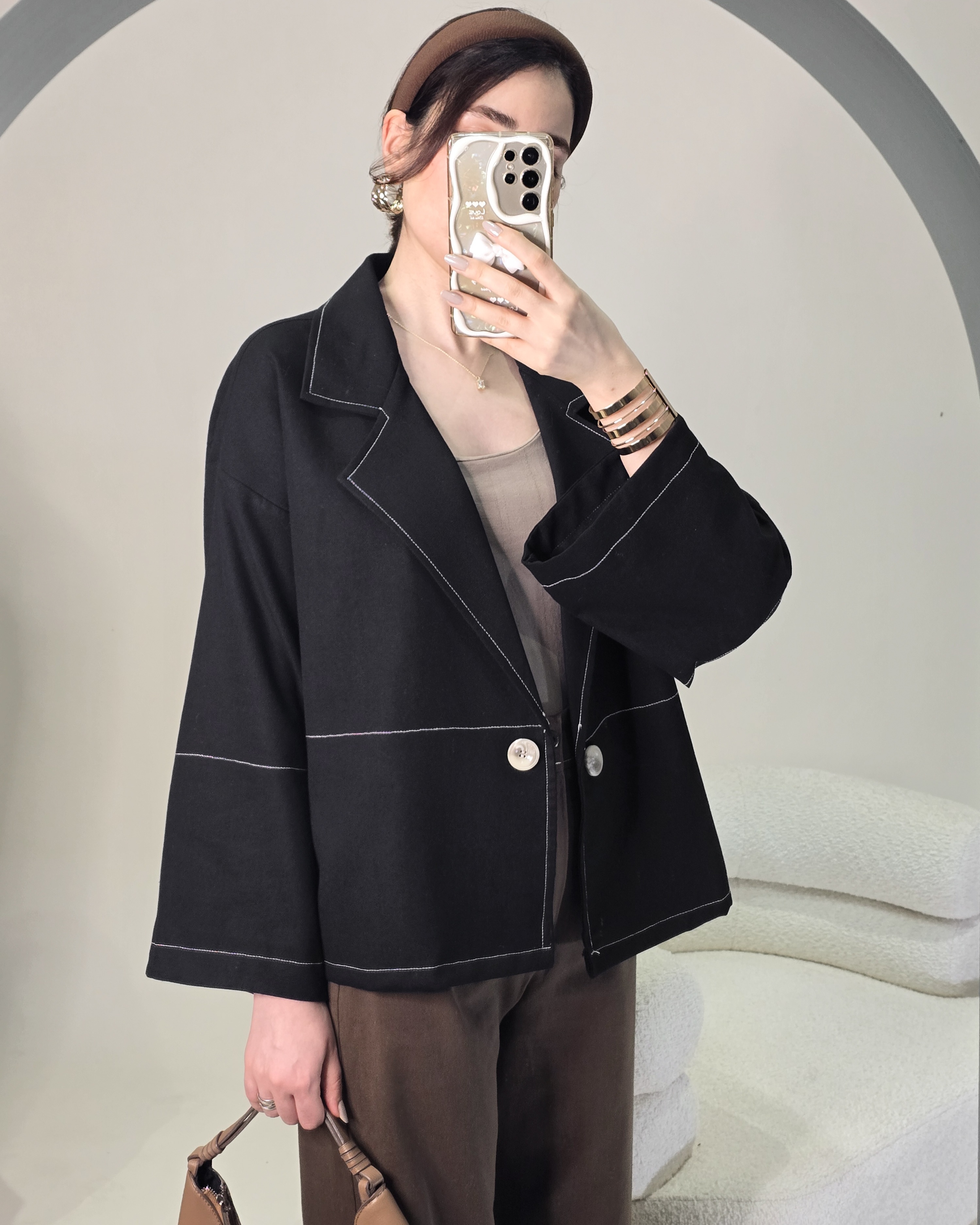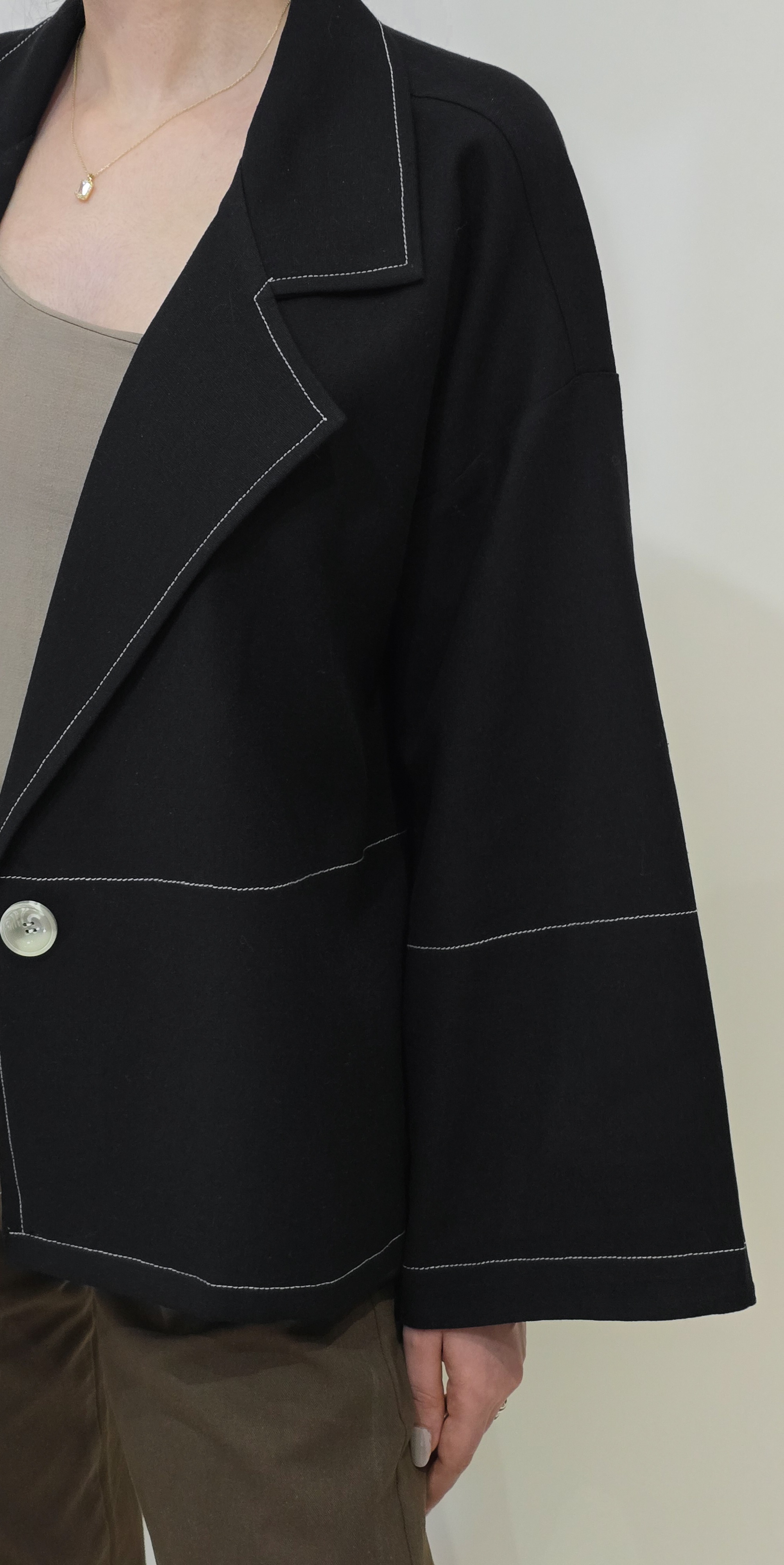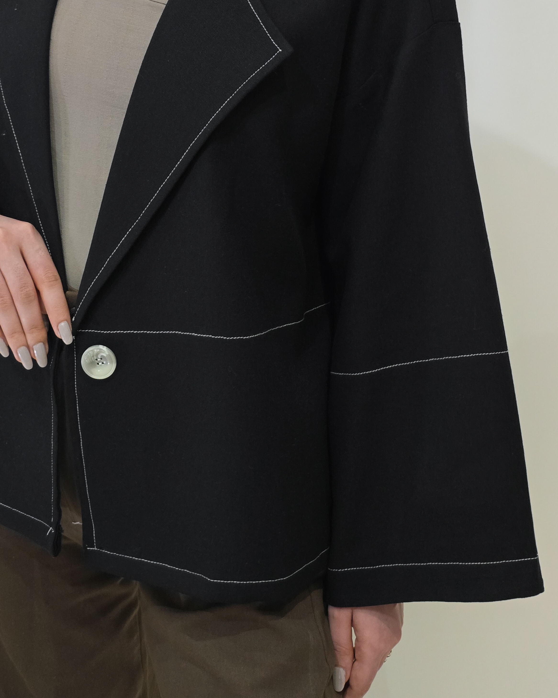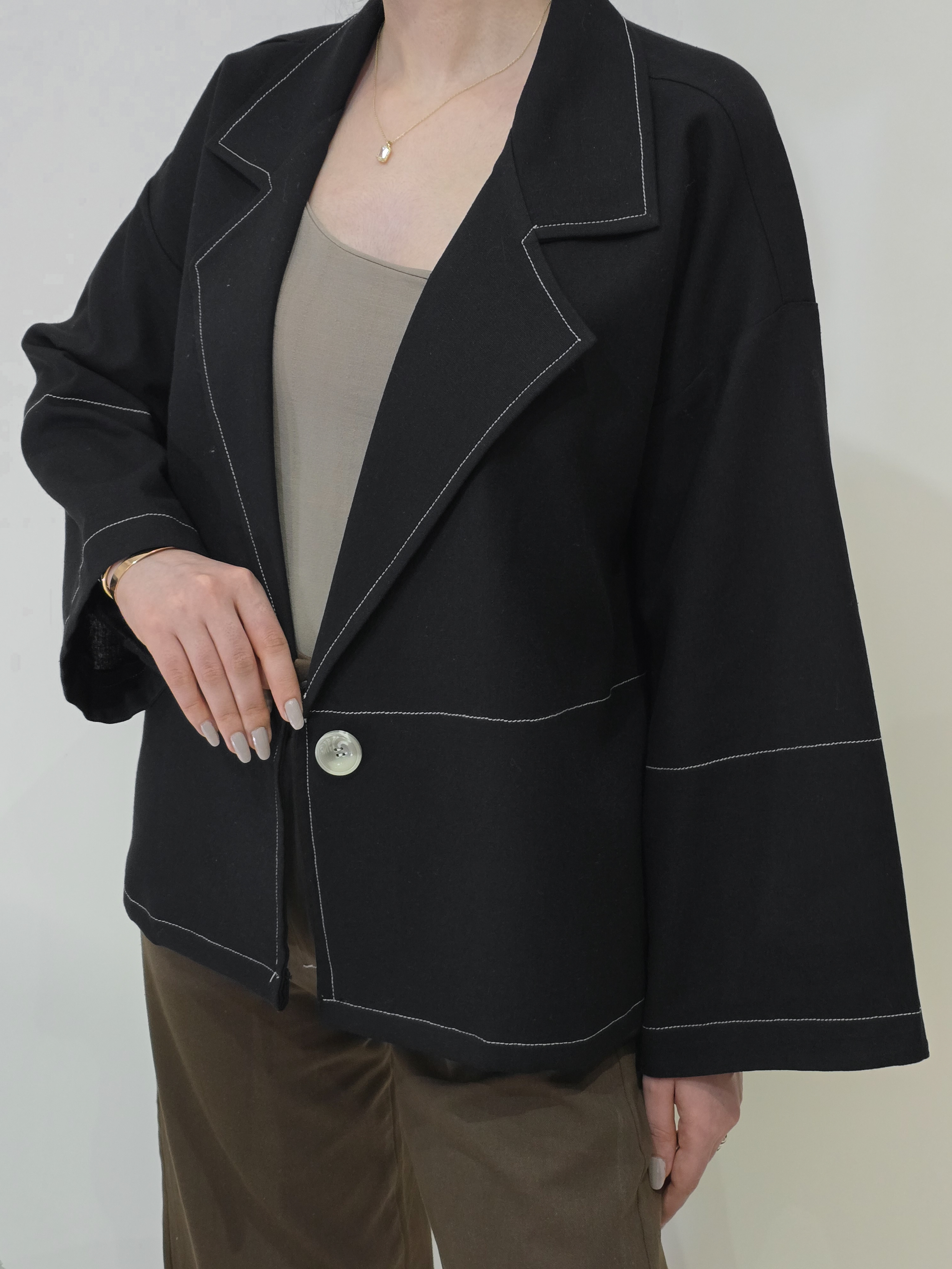 ●لینن کت مشکی (جنس لینن ضخیمتر از معمول) قد کت: ۶۵ برش آزاد و لایی کار شده