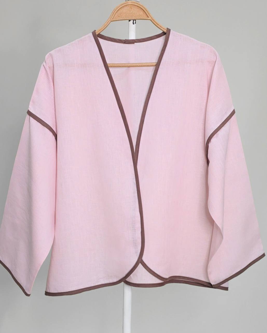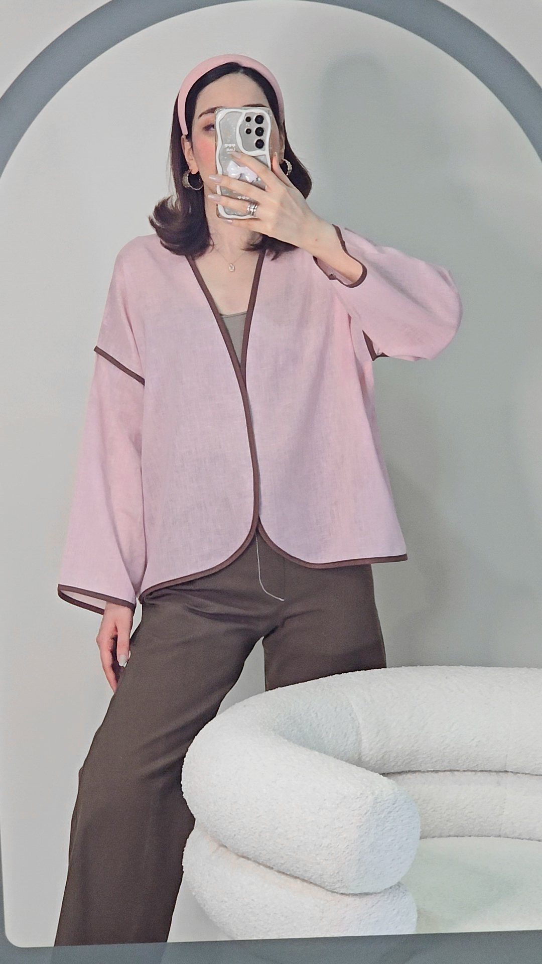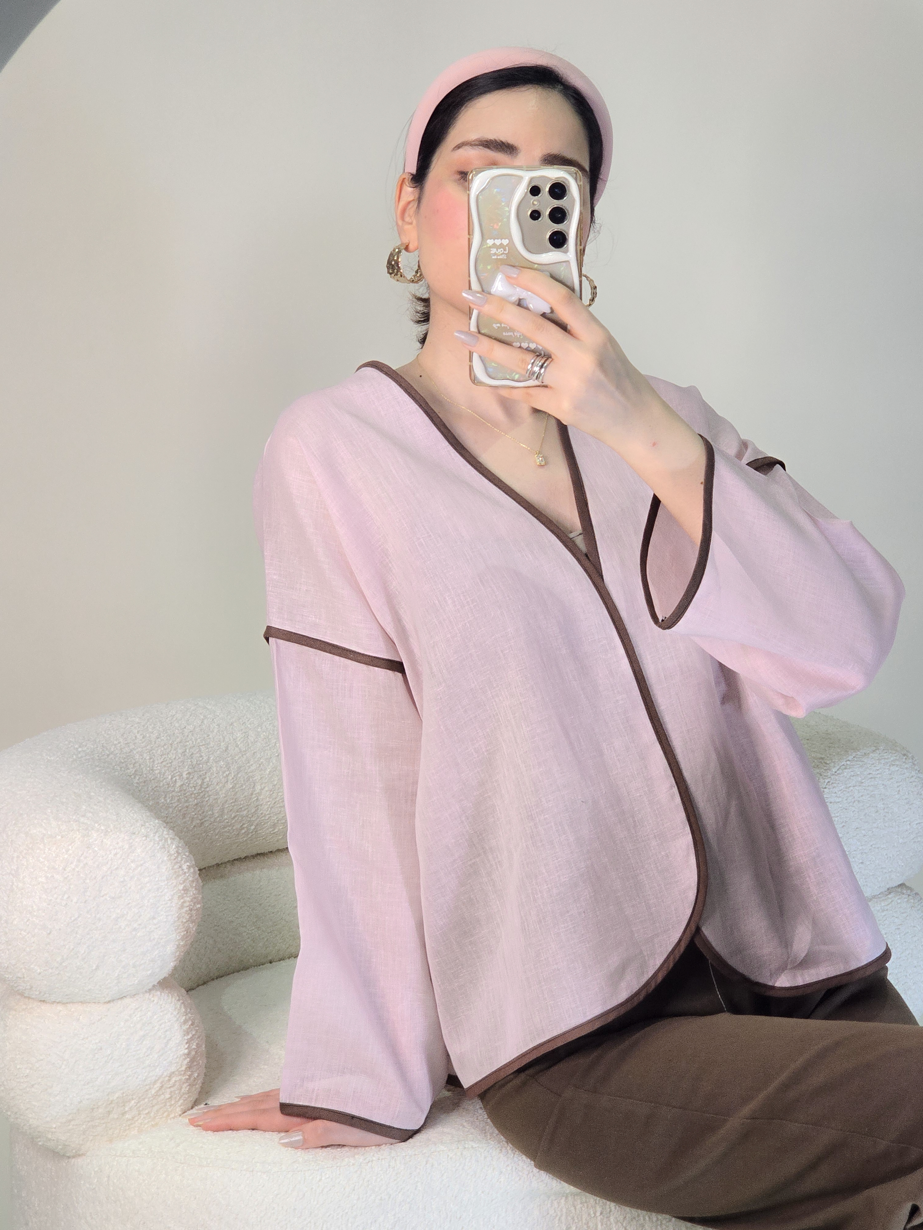 ●لینن کت صورتی پودری با نواردوزی قهوهای قد : ۶۵فری سایزخنک و راحت مناسب بهار و تابستان تک رنگ