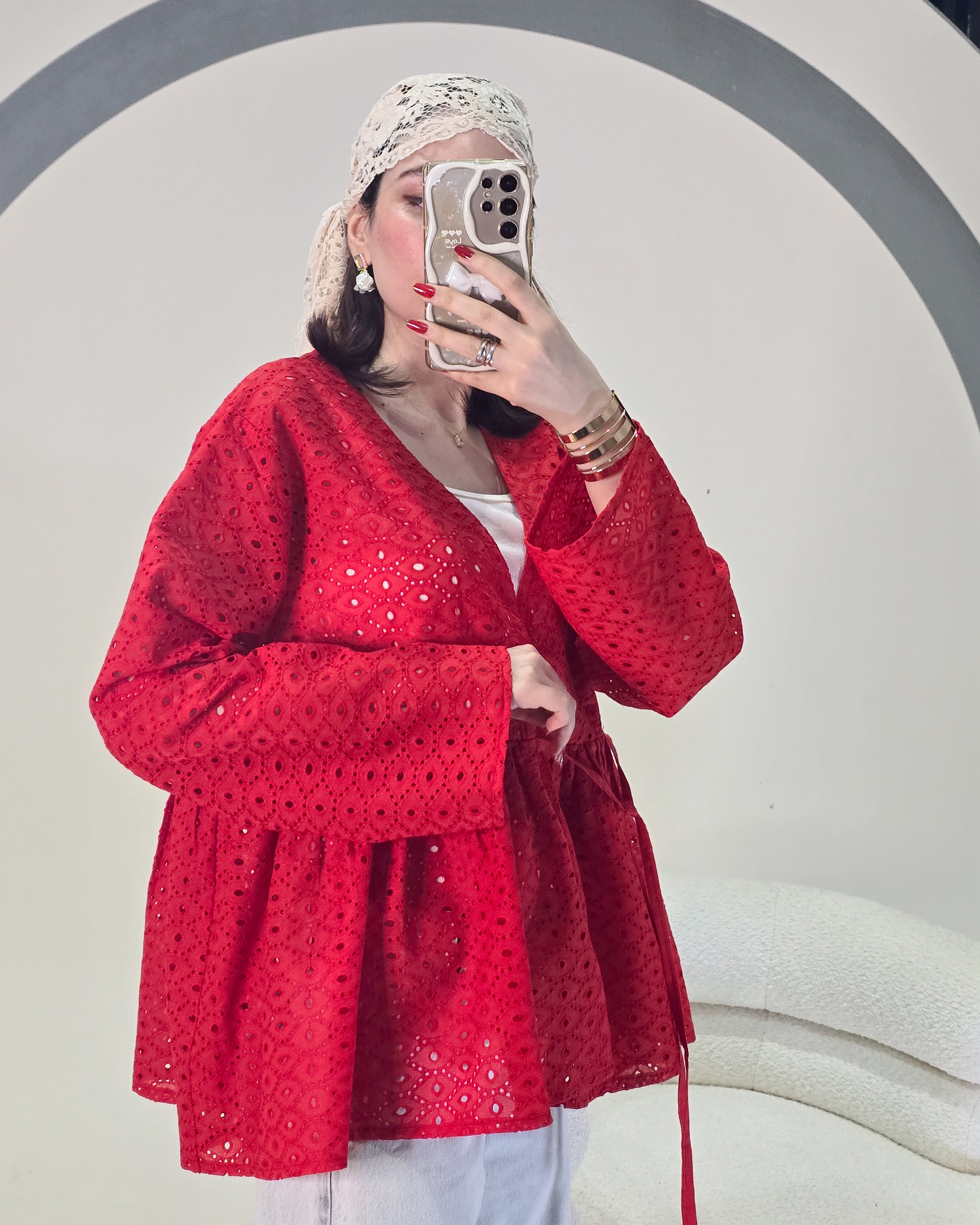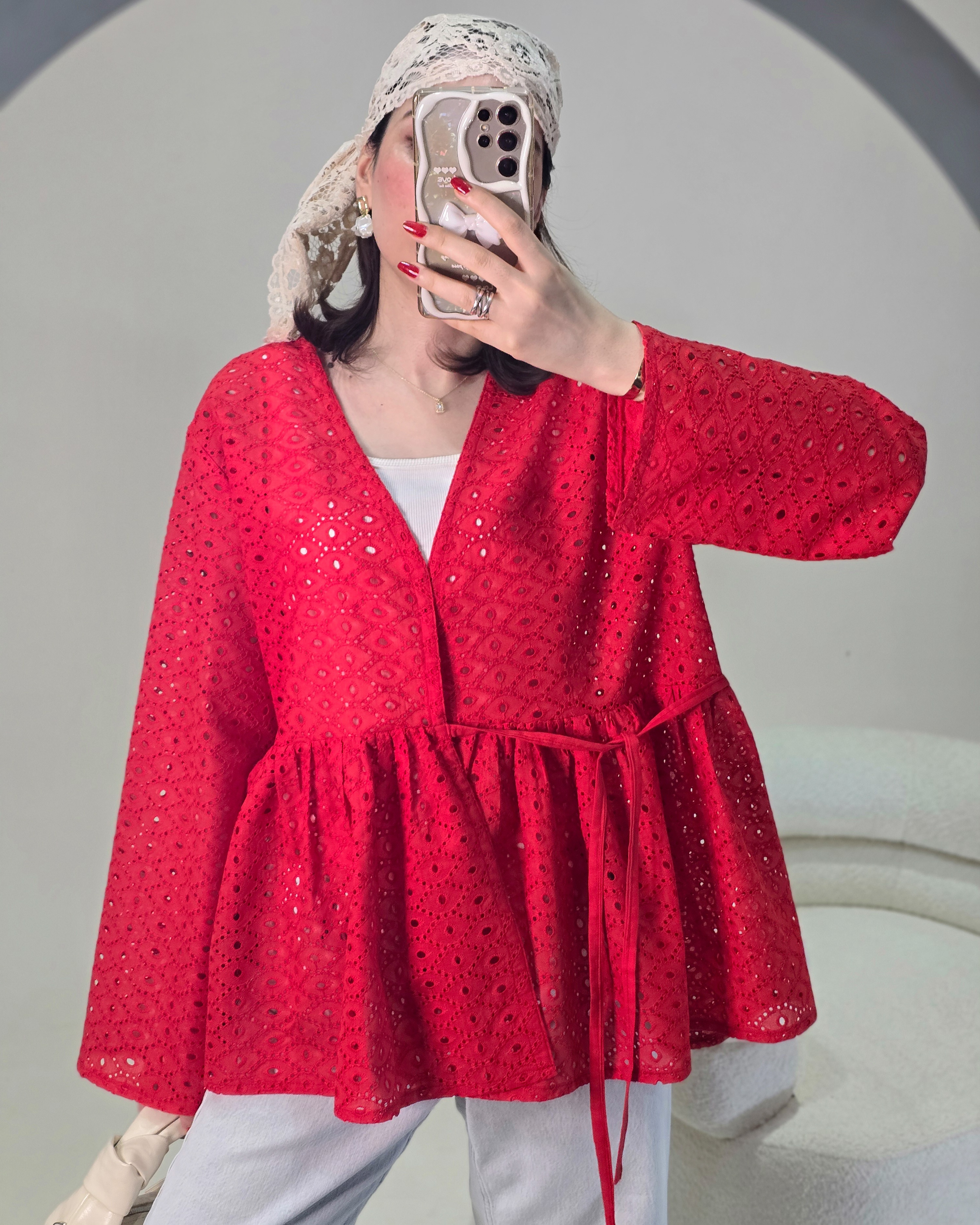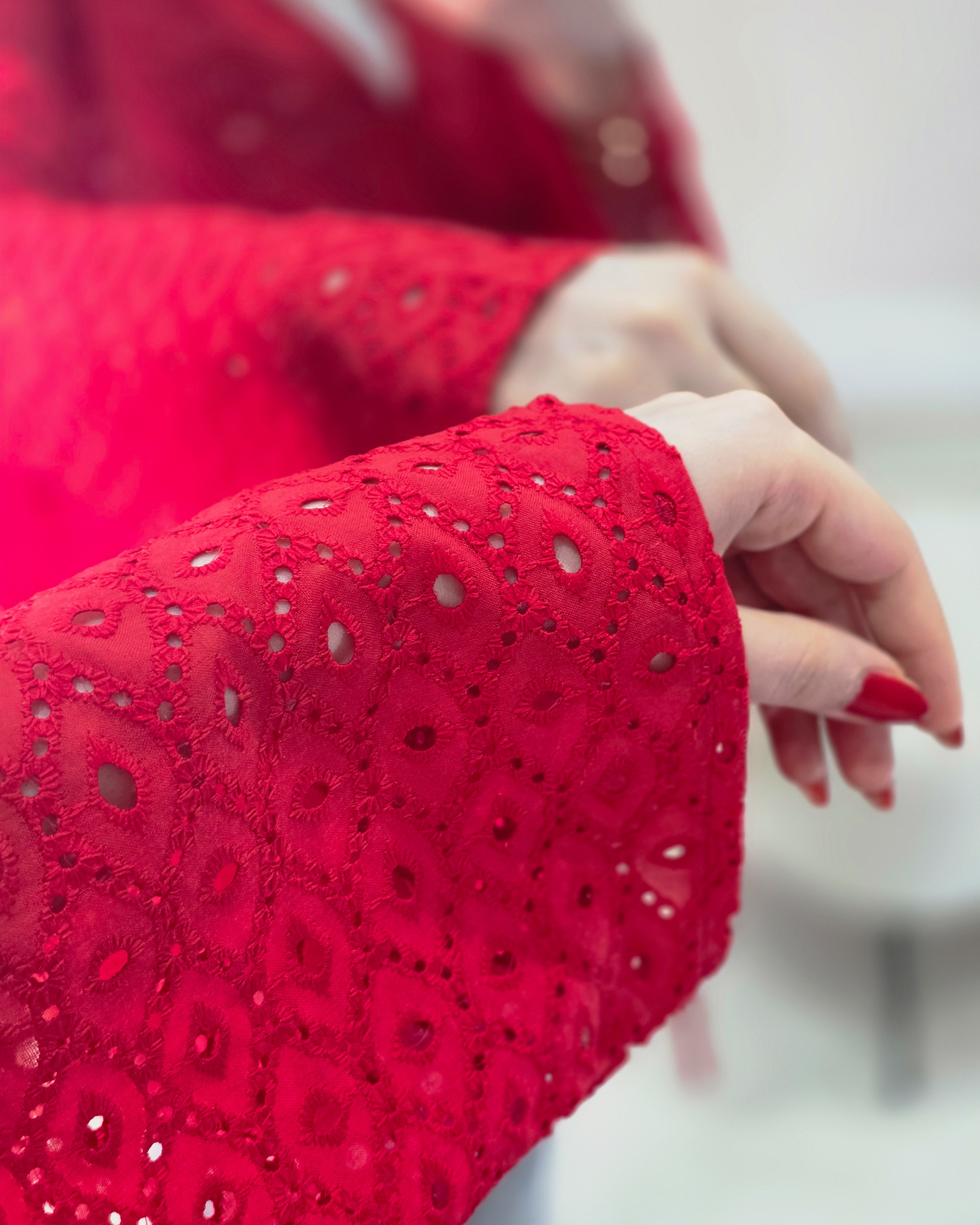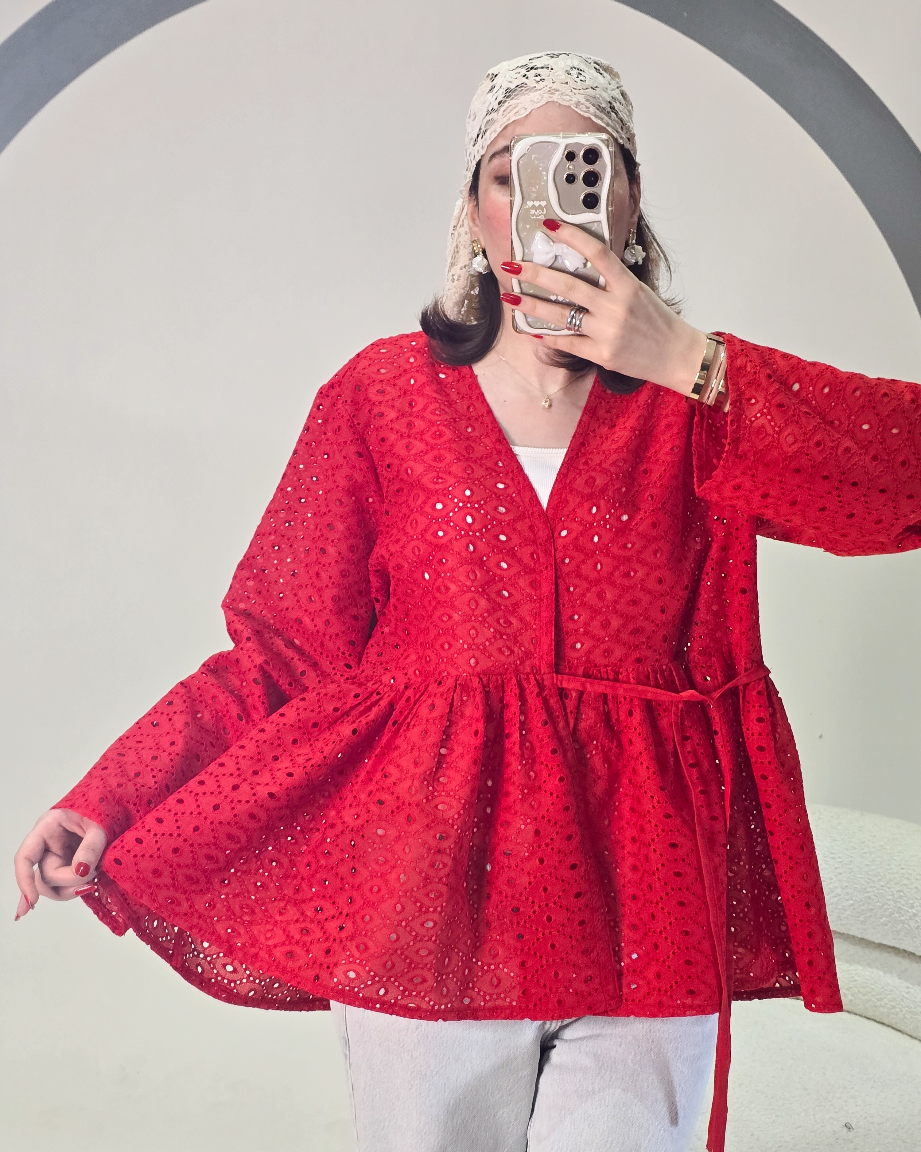 ■ پیراهن خامهدوزی قرمز فری سایز و آزاد دارای کمربندقد :۶۵ خنک و مناسب تابستون تک رنگ