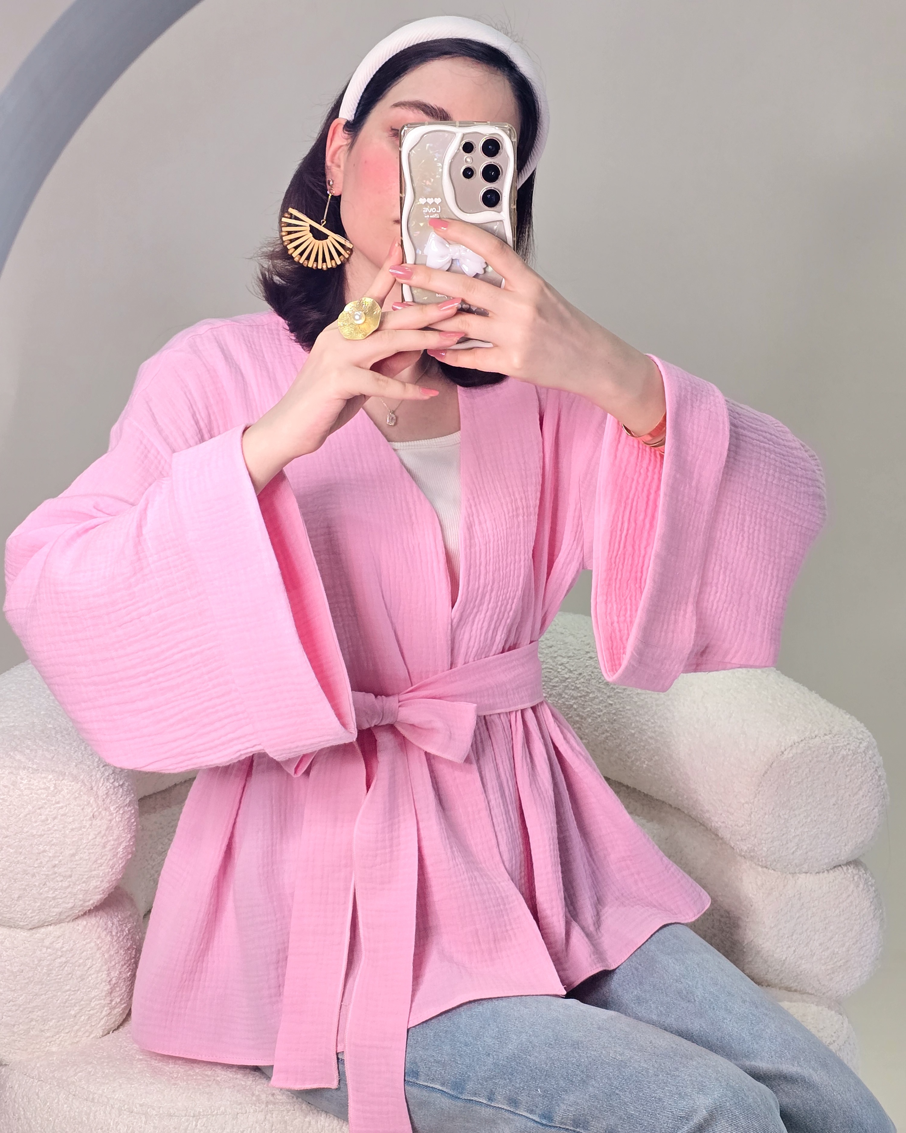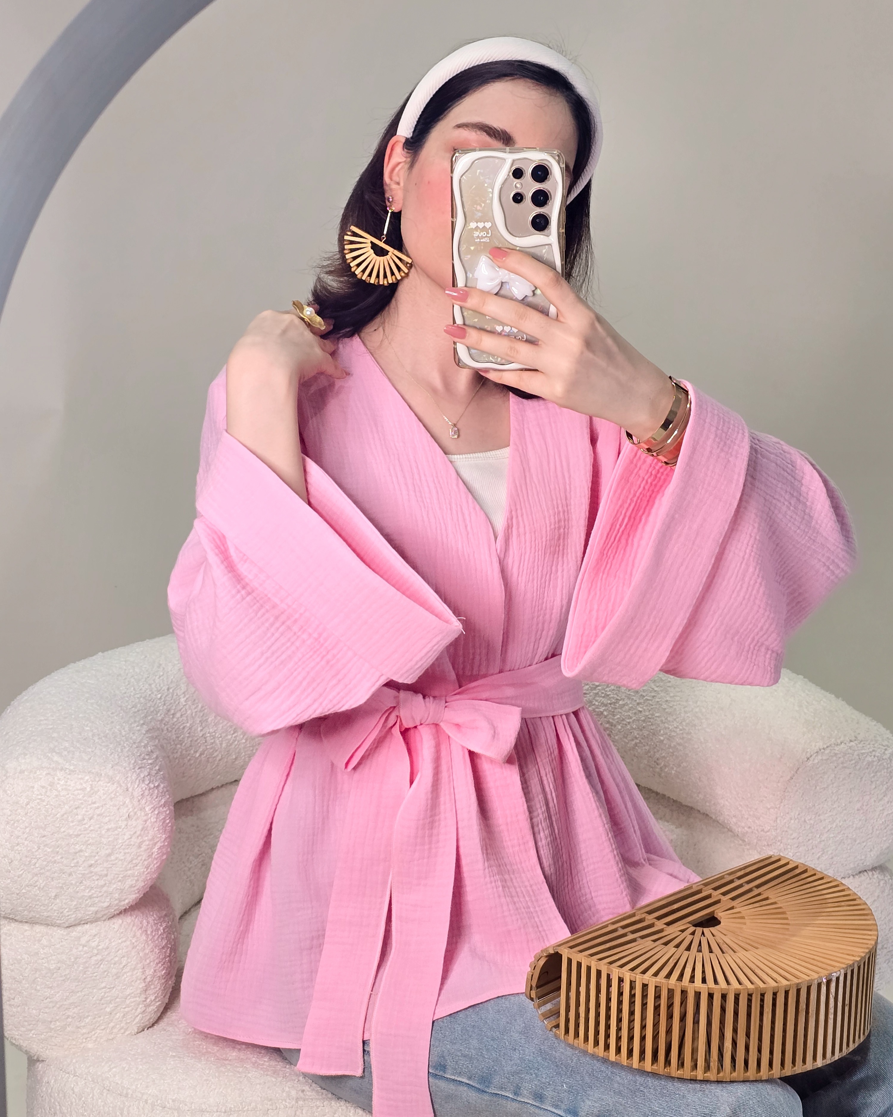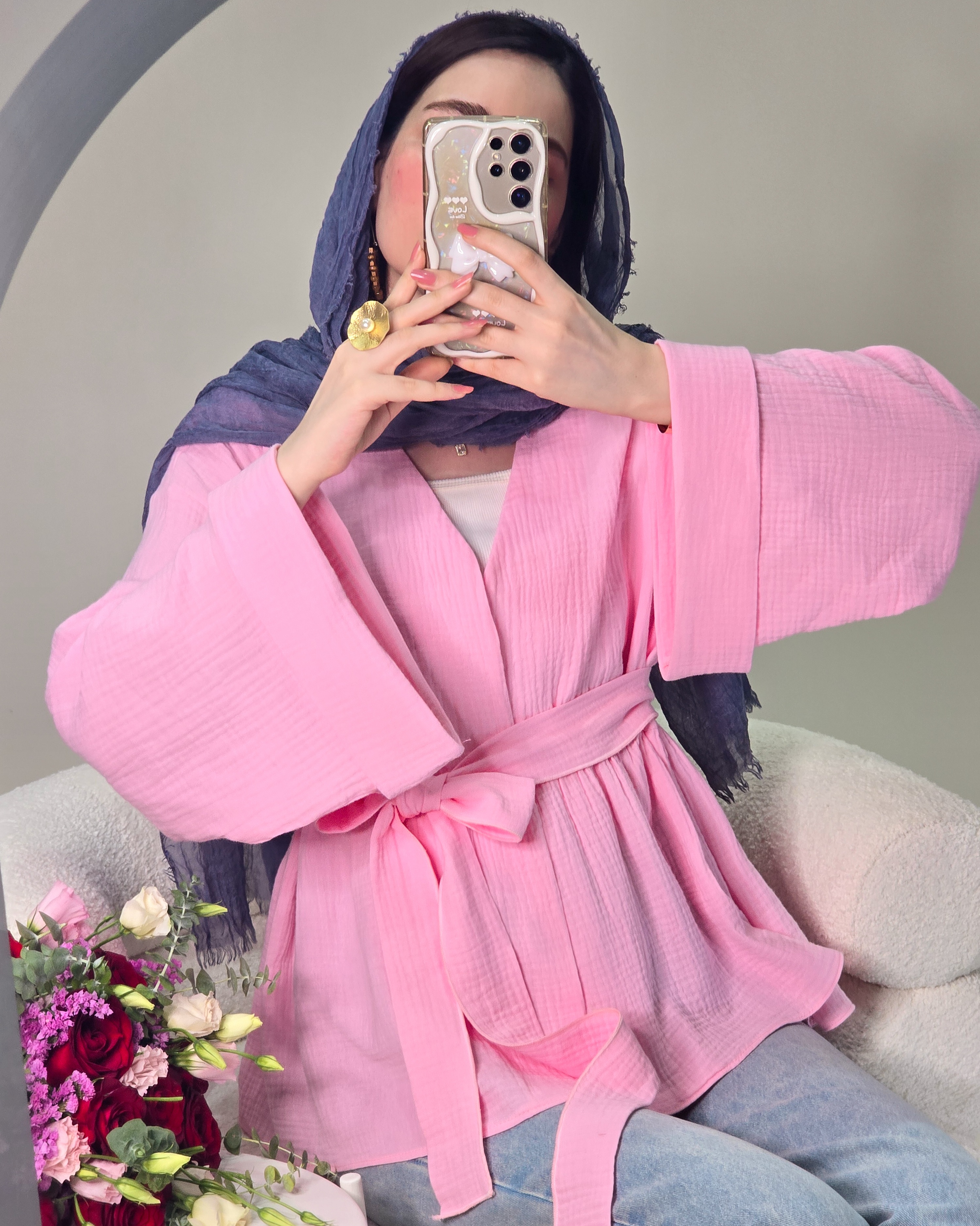 ▫️فریسایز و آزاد (قد لباس در عکس: ۷۰ | قد مدل: ۱۷۰) ▫️کمربند قابل تنظیم: کنار، وسط یا پشت□رنگ بندی: صورتی_کرم