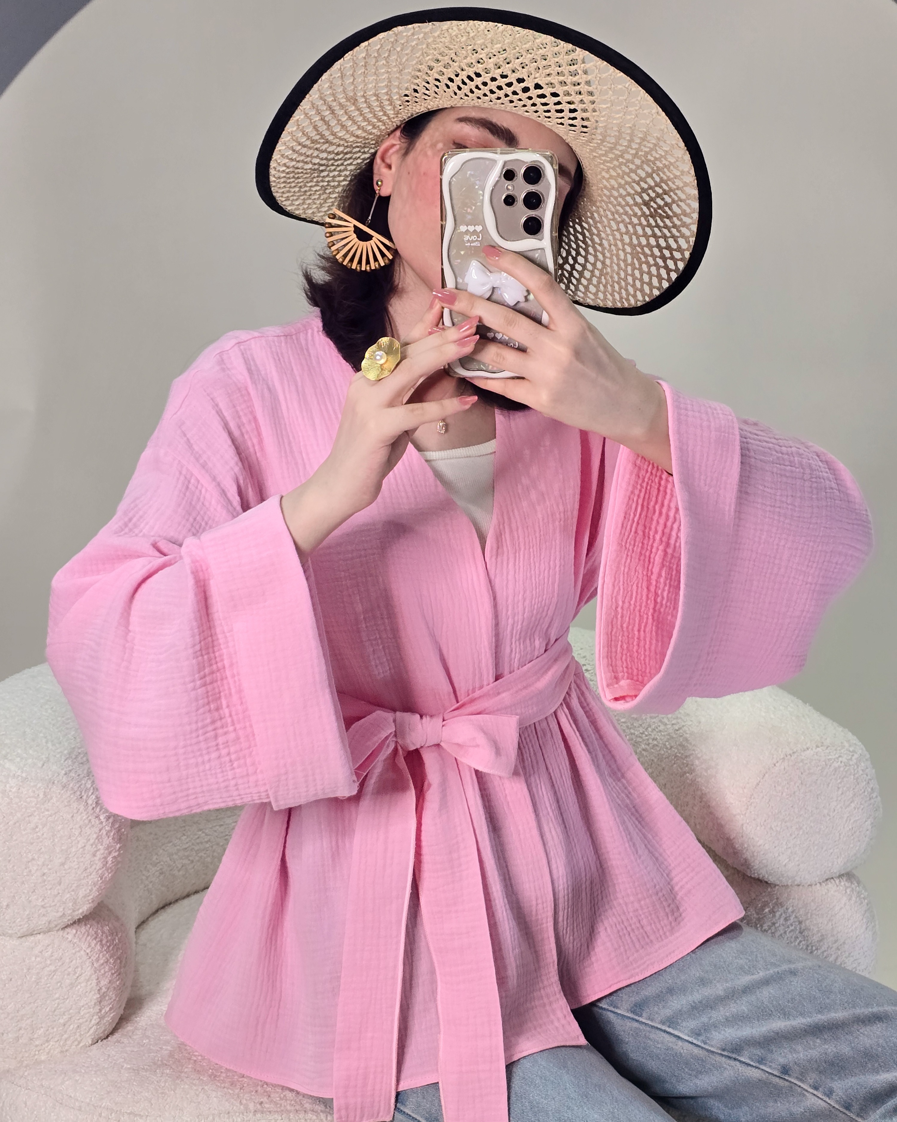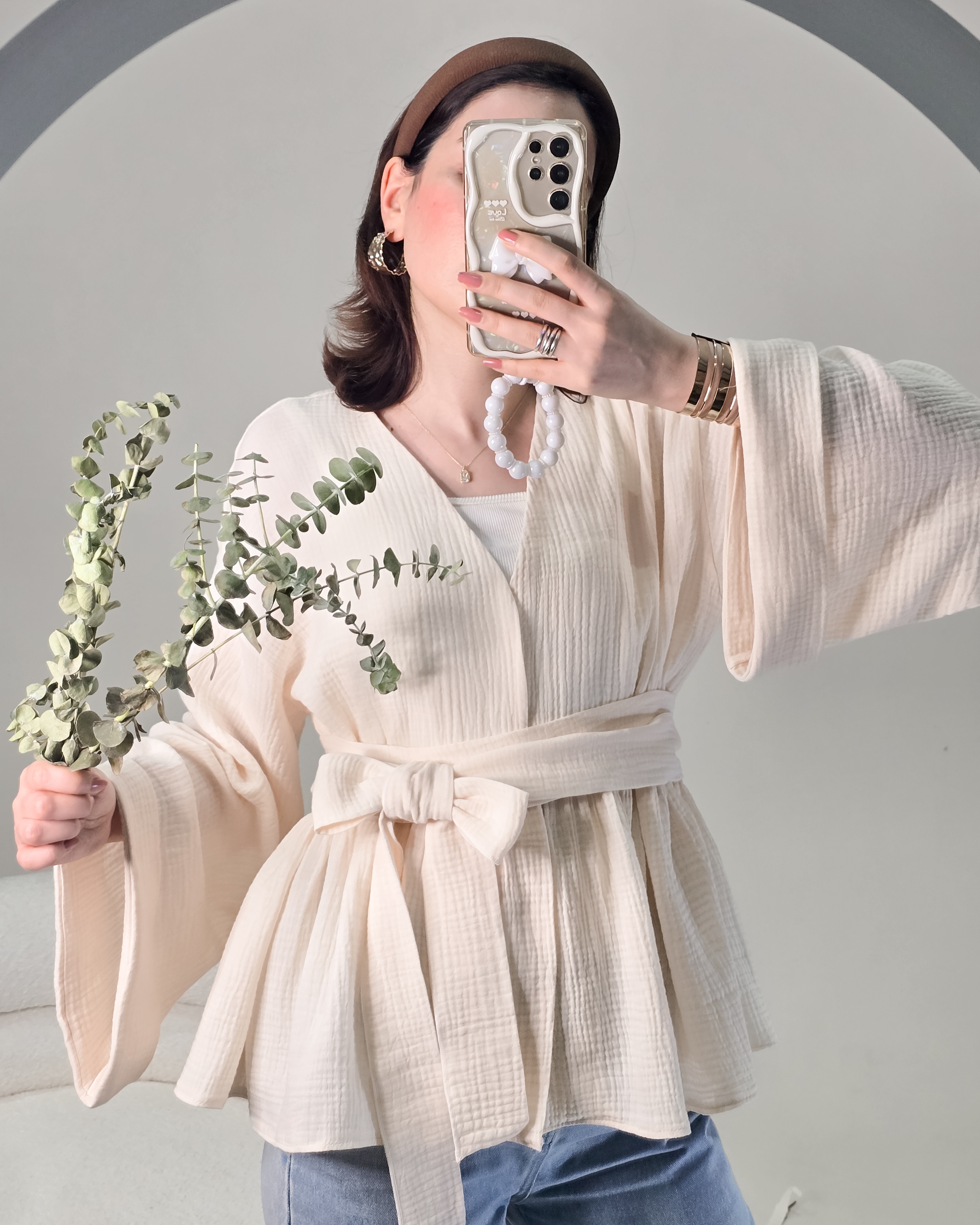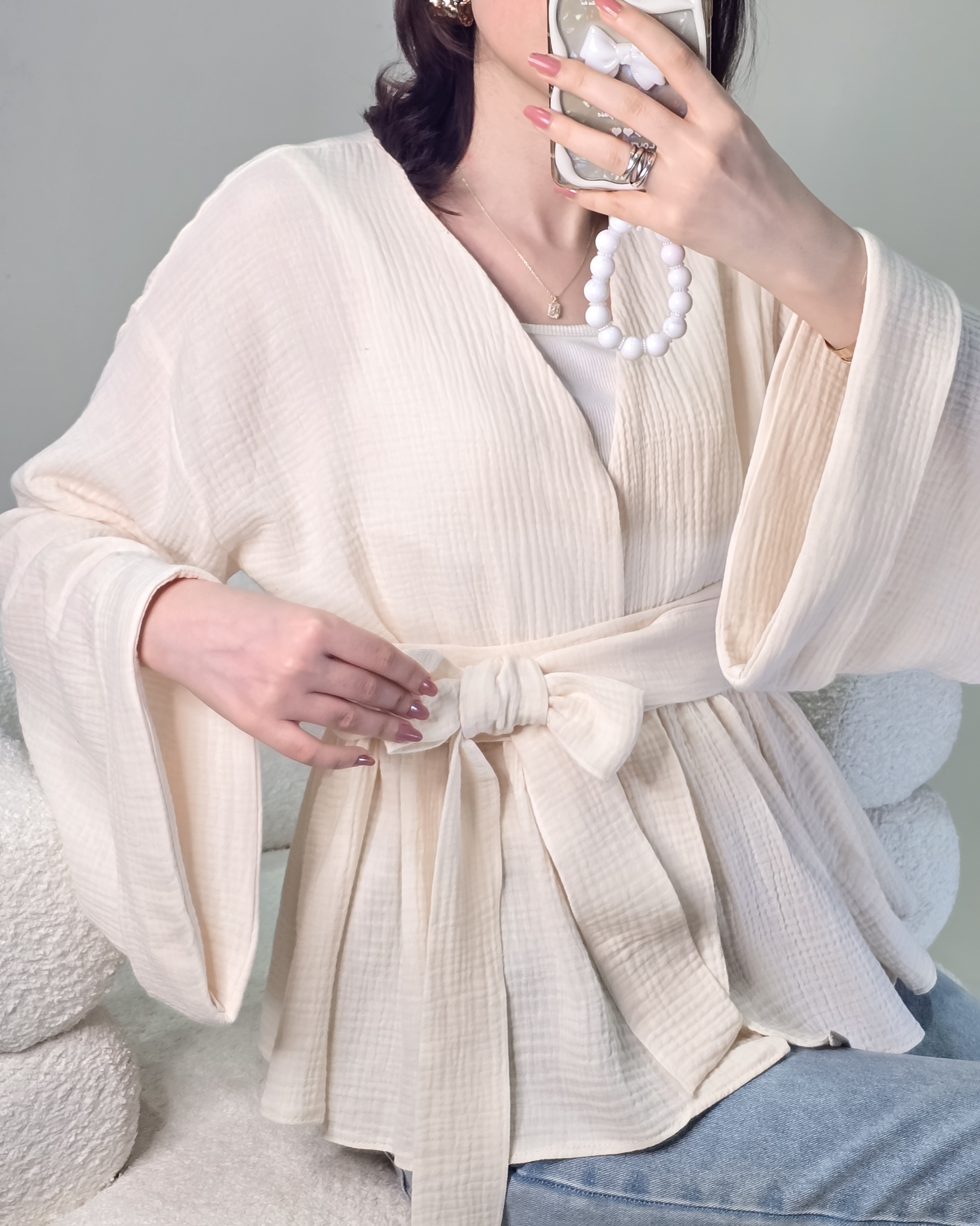 ▫️فریسایز و آزاد (قد لباس در عکس: ۷۰ | قد مدل: ۱۷۰) ▫️کمربند قابل تنظیم: کنار، وسط یا پشت□رنگ بندی: صورتی_کرم
